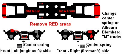 Pull off Athearn sideframes carefully. Grind off the center "Airbag" and glue in a surplus "spring" from a scrap sideframe. Install shock absorbers and brake cylinders on 2 sideframes. Press them onto the "front" truck. As the diagram shows, the front left sideframe should have it's brake cylinder removed, and the front right should have the shock absorber ommited so the truck can clear the side steps. Put them on the remaining (rear) truck.